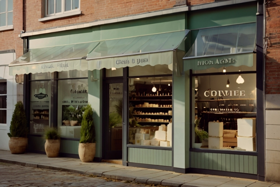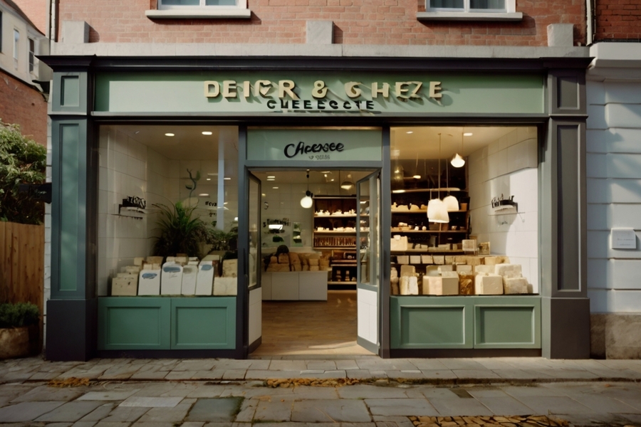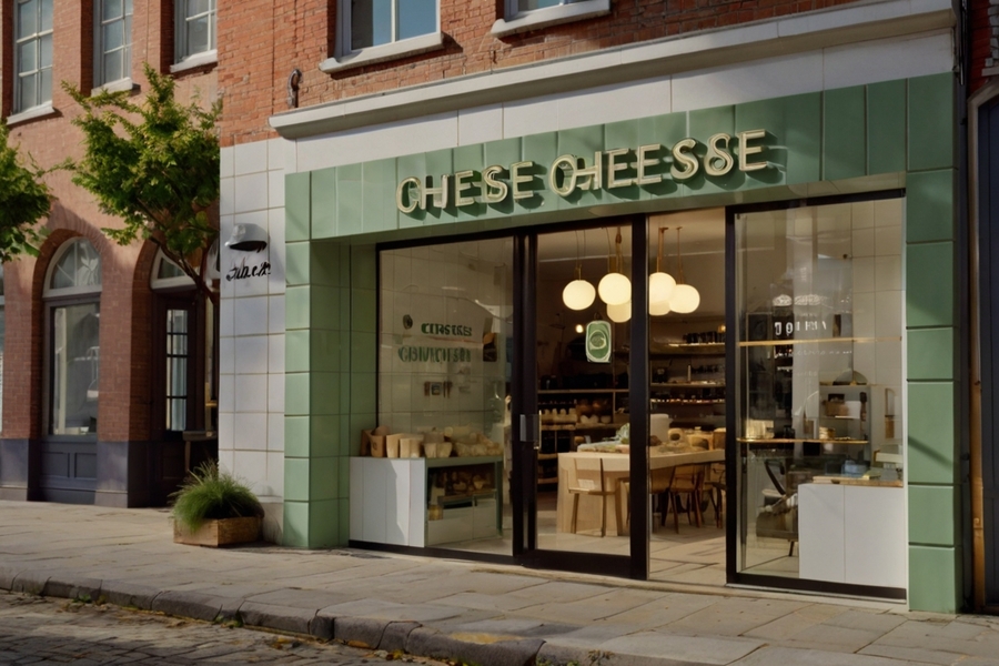 Prompt: A modern deer milk cheese store, Cheese & Oven has an elegant and attractive facade with large glass windows through which you can see the cheese counter inside. The exterior is decorated with dull dark green and white tiles, echoing the clean design of the interior. Above the entrance hangs a stylish, minimalist sign with the store’s name, which is softly illuminated, creating a warm, welcoming atmosphere. Potted plants and greenery frame the doorway, giving it a natural charm. The atmosphere is bright and inviting, attracting customers with its modern yet cozy aesthetic.