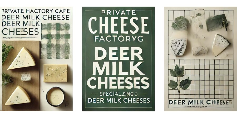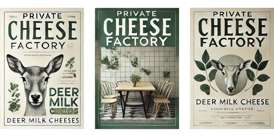 Menu prompt: The menu for a modern private cheese factory café specializing in deer milk cheeses is designed with a focus on sophistication and simplicity. The layout uses a muted dark green background with white text in a sans serif geometric grotesque font for readability and a clean aesthetic. Delicate vegetal patterns, like intertwining vines and leaves, subtly frame the edges of the menu, creating a natural and artisanal vibe. Sections for cheeses, beverages, and desserts are clearly separated, each with elegant line dividers. The overall design emphasizes the café's modern, eco-conscious approach.