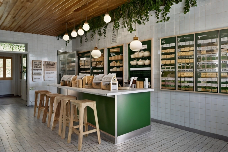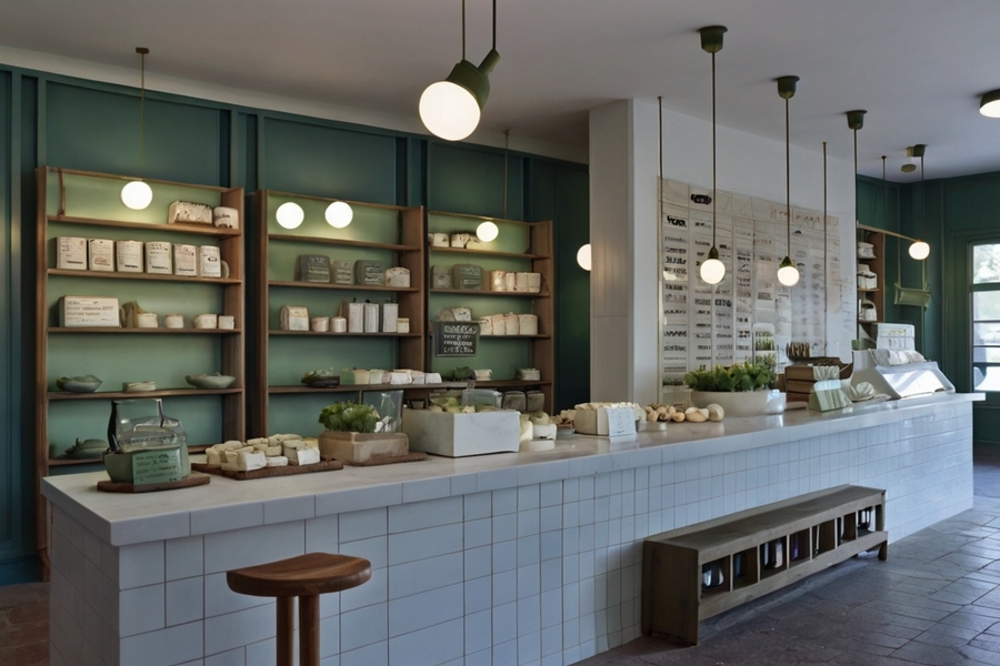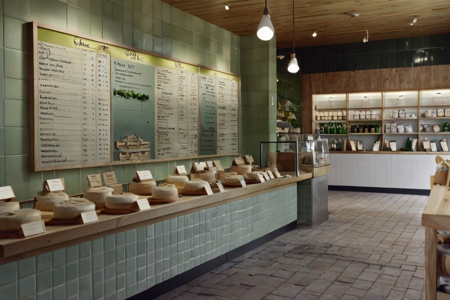 Prompt: In the modern deer milk cheese shop, a menu with a list of flavors and prices for cheeses is posted on the wall, lined with pale green tiles. Cheeses and packages of cheeses are displayed on the counter, lined with white tiles, and there is a cash register. Рotted plants add a touch of greenery to the room. Overall, the atmosphere is clean and inviting.