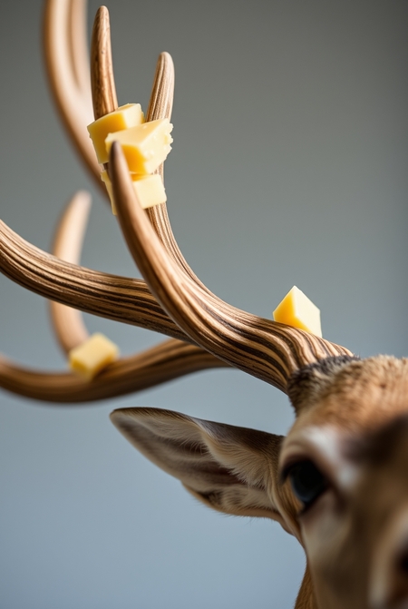 Close-up shot, gentle soft light, diffused shadows, subtle illumination, detailed focus, deer antler with cheese pieces on horns against a #242F45 background, realistic photo style, natural aesthetics.