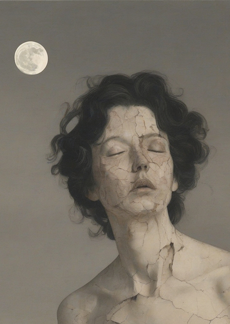 Человек, чья кожа похожа на потрескавшийся фарфор, смотрит на полную луну. Первые два изображения смогли хорошо передать запрос, создав не только картинку в стиле Чарльза Нормана Блейми, но и в целом композиционно и стилистически красивые сюжеты, которые могли бы понравиться многим. На первой очень хорошо то, что лицо героя деконструировалось в соответствии с идеей, а окружение из сухих камней дополнило одинокое существование фигуры. Вторая картинка вышла чуть ли не самой красивой во всем проекте, так как эмоция, переданная на лице девушки коррелирует и с заданием и с ощущением вокруг, заставляя прочувствовать сонную атмосферу и приятный ночной ветерок.
