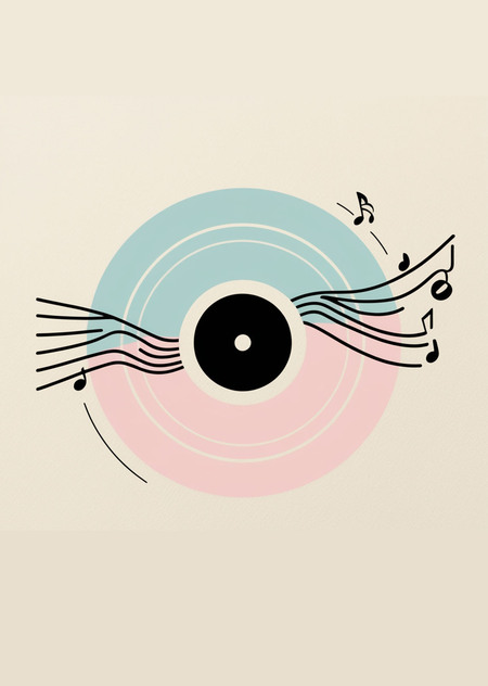 Обложка сгенерирована с помощью нейросети. Промт: The design features a representation of a vinyl record withflowing lines surrounding it to give a sense of movement and rhythm. The overall look is clean, stylish of the music industry in pastel shades with a musical note in minimalism.