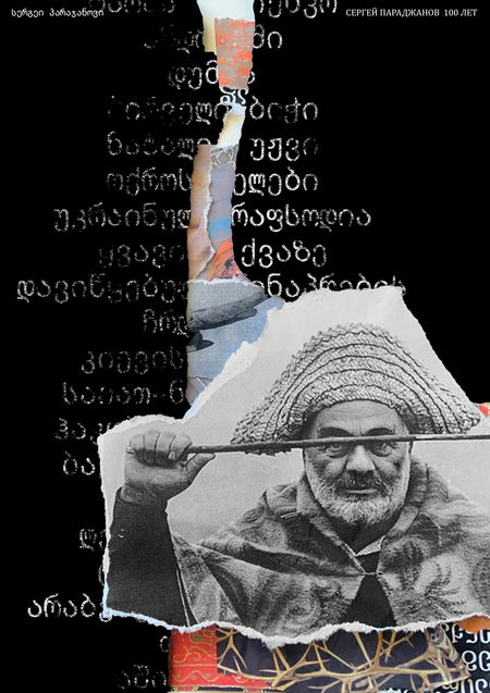 Было разработано дизайн-решение с использованием техники коллажа и характерной текстуры у текста. Такое сочетание передает специфику съемки Сергея Параджанова в своих фильмах.