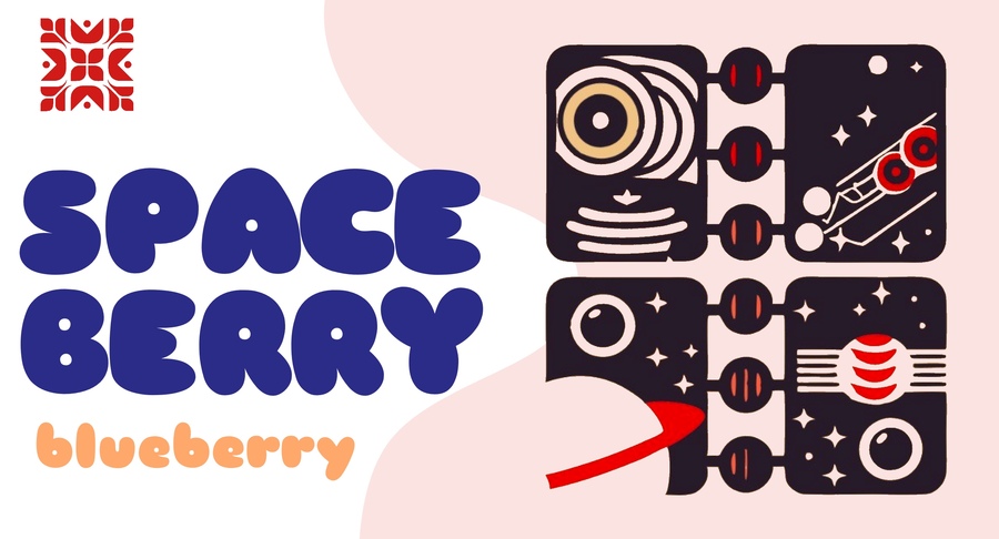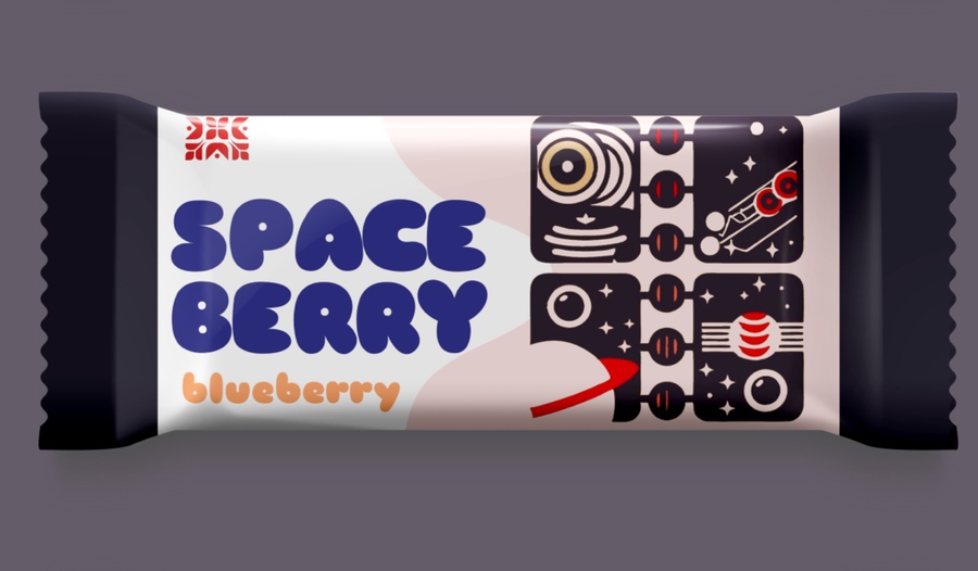 промпт: a design of a label for cereal bar with blueberry (/cranberry/cherry), the drawings are on the right side of label, asthetics is space retro futurism (Сгенерировано в Recraft, доработано в Procreate)