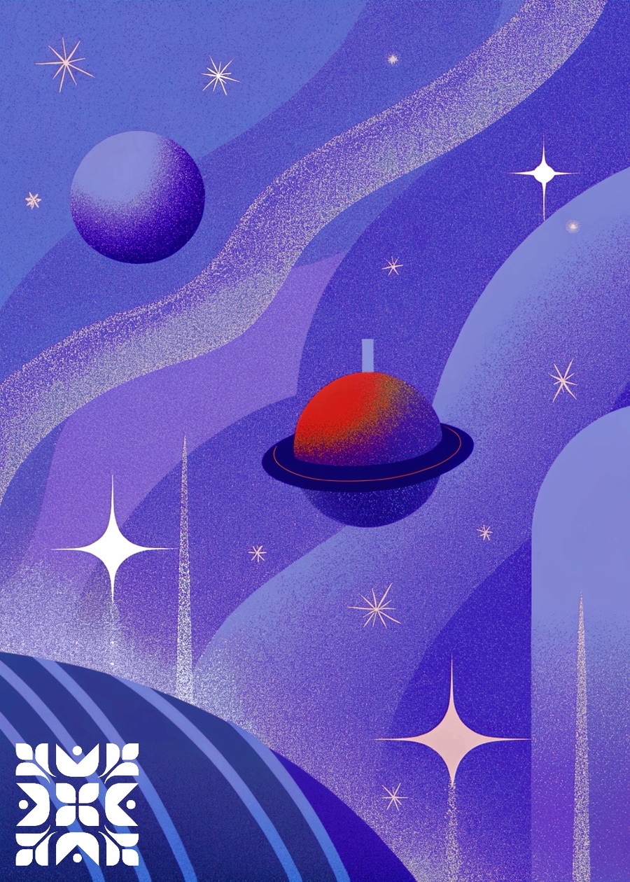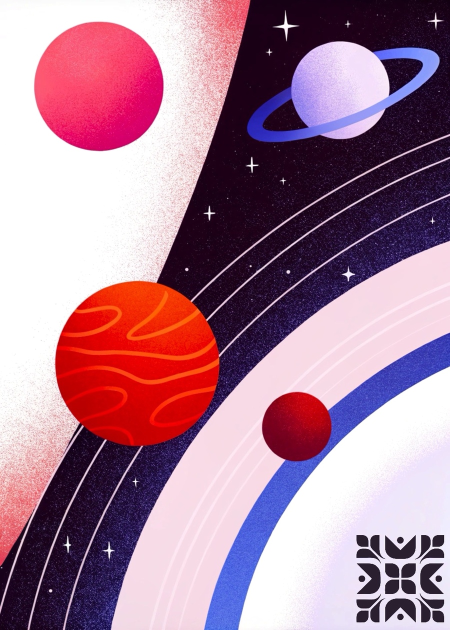 промпты для всех постеров: an advertisment poster without text in space retro futurism aesthetics, include different planets and dimensions. сгенерировано в Recraft, добавлено лого и доработаны цвета в Procreate
