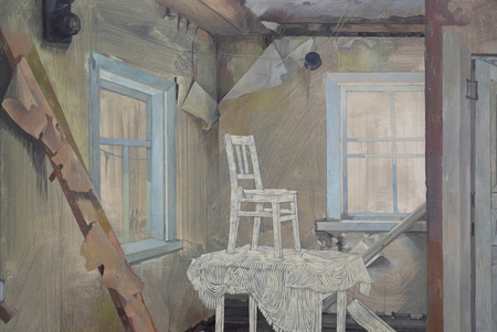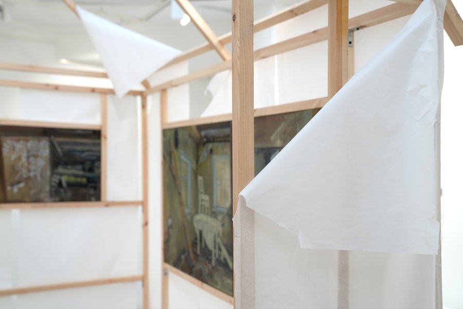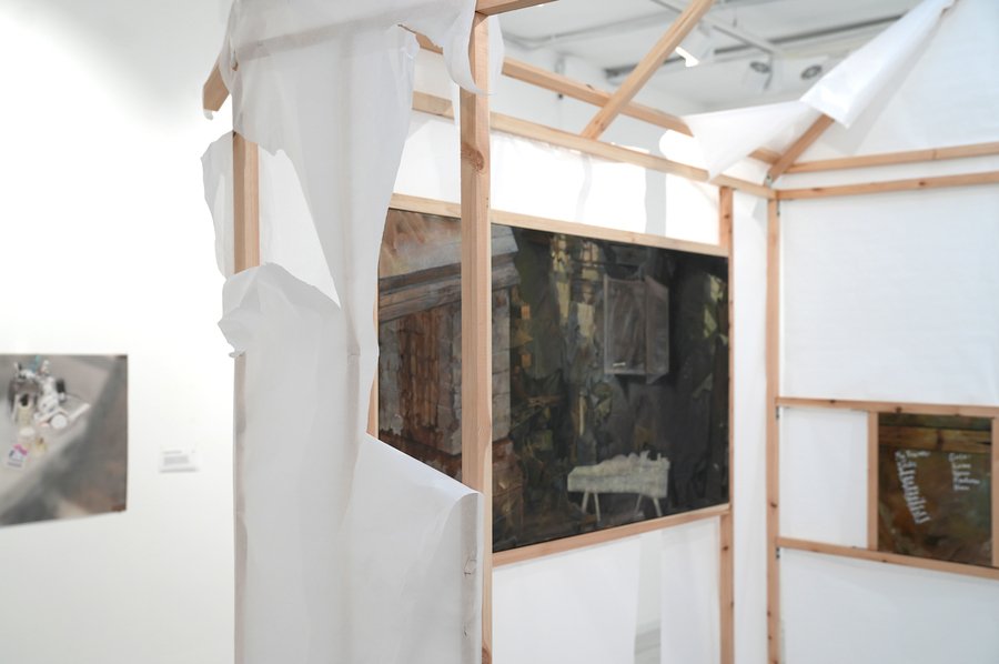 В основе проекта — личные воспоминания от пребывания в деревне-призраке «Подколодье». Заброшенные дома, десятилетиями лишённые прямого назначения, становились пространством для спонтанных практик: внутри них перемещали мебель, прокладывали новые маршруты движения, переизобретали логику обжитости. Пустота переставала быть фоном — она становилась активной средой, собирающей вокруг себя действия. Эта логика нашла продолжение в инсталляции — минималистичном объёме дома, собранном из конструктивного каркаса и полупрозрачной бумаги. Бумага реагирует на движение, улавливает прикосновения, позволяя лишь частично разглядеть содержимое, оставляя пространство догадки.