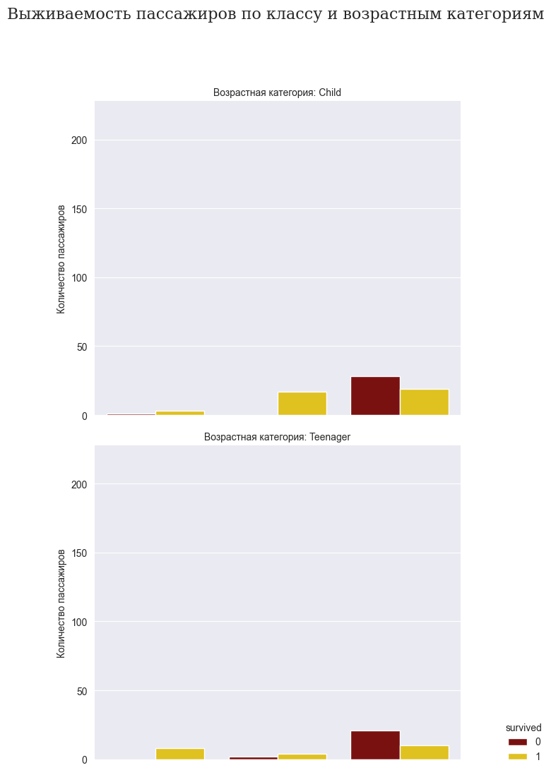 Настройка заголовков и подписей g.set_titles ('Возрастная категория: {row_name}') # Заголовки для фасетов g.set_axis_labels ('Класс', 'Количество пассажиров') # Подписи осей g.fig.suptitle ('Выживаемость пассажиров по классу и возрастным категориям', fontsize=16, fontfamily='serif', y=1.05) # Общий заголовок