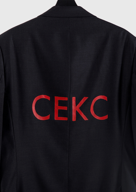 Инсталляция исследует трансформацию объекта через силу знака, демонстрируя, как одно слово может изменить восприятие, ценность и статус вещи. Обычный мужской пиджак, найденный в секонд-хенде, становится предметом желания, модным артефактом, просто благодаря надписи «СЕКС» на его спине. Этот жест разоблачает механизмы рекламы, где образы и слова создают искусственные ценности, превращая повседневное в желаемое.