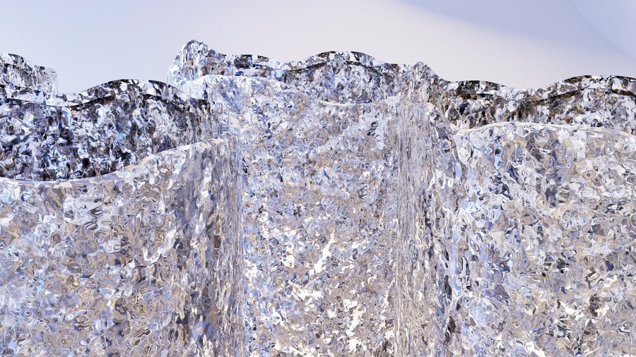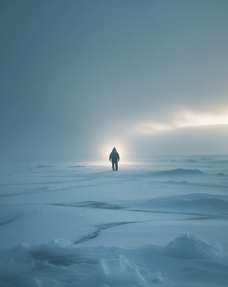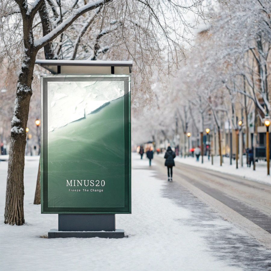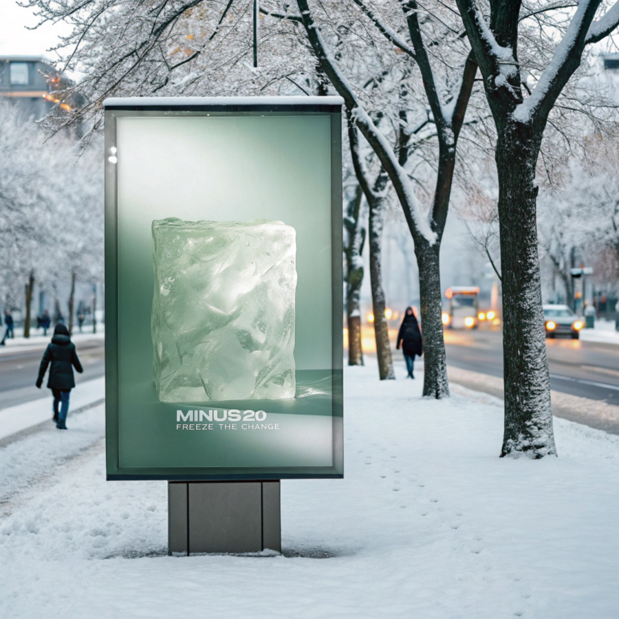 «A futuristic Arctic-inspired retail kiosk for selling water from an Arctic iceberg, branded as MINUS20. The kiosk is seamlessly integrated into a frozen landscape, surrounded by ice and snow. The atmosphere is misty, with soft, diffused lighting. The design resembles an actual ice formation, with transparent icy surfaces and frosted textures. A few sleek, minimalist water bottles are nestled in a snowdrift among clear ice chunks, reflecting the purity of glacier water. The scene exudes a sense of ecological awareness and exclusivity, blending nature with modern aesthetics. High detail, cinematic composition, 8K resolution, photorealistic rendering.»