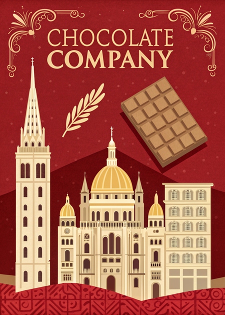 1. «create packaging for chocolate. the background should be dark red, architectural buildings should be in beige, dark brown and light colors. The name of the chocolate and the company should be written on top. half the package should be red and the other half red» 2. «advertising posters with an image of chocolate, a red background and architectural buildings and with beige, dark brown and gold colors, and with different inscriptions on top» 3. «make a minimalistic logo for a chocolate production company. with red background, gold font and buildings and architectural building» 4. «make a logo for a chocolate production company. with red background, gold font and buildings and architectural building» 5. «poster with red background, chocolate and golden architectural buildings in beige and tempo brown»