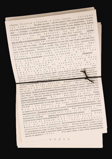 Верстка пьесы повторяет интонацию героя, потому что главное то, что это не просто рассказ, а именно личное высказывание. Основной прием — экстремальный трекинг: герой говорит медленно — текст растягивается, быстро — сжимается