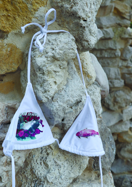 Для инсталляции был создан образ, целиком и полностью покрывающий модель в визуальном мусоре, перенесённом на одежду при помощи ручной печати: лиф, колготки, майка, юбка, митенки, переводные тату.