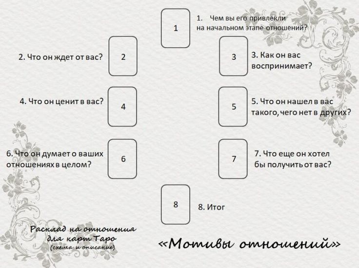 5. Расклад «Взаимоотношения»: • Значение: Этот расклад используется для анализа отношений между двумя или более людьми. Он помогает понять динамику взаимоотношений, проблемы и возможности для их улучшения. Каждая карта представляет роль или аспект отношений.
