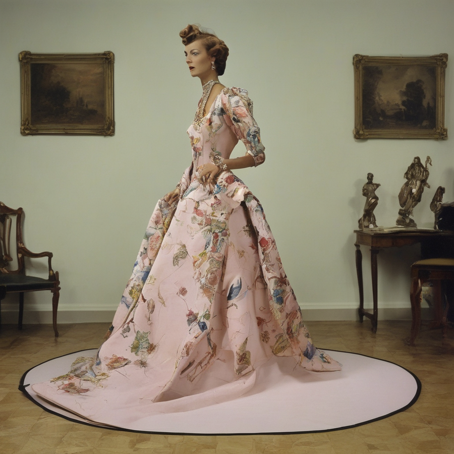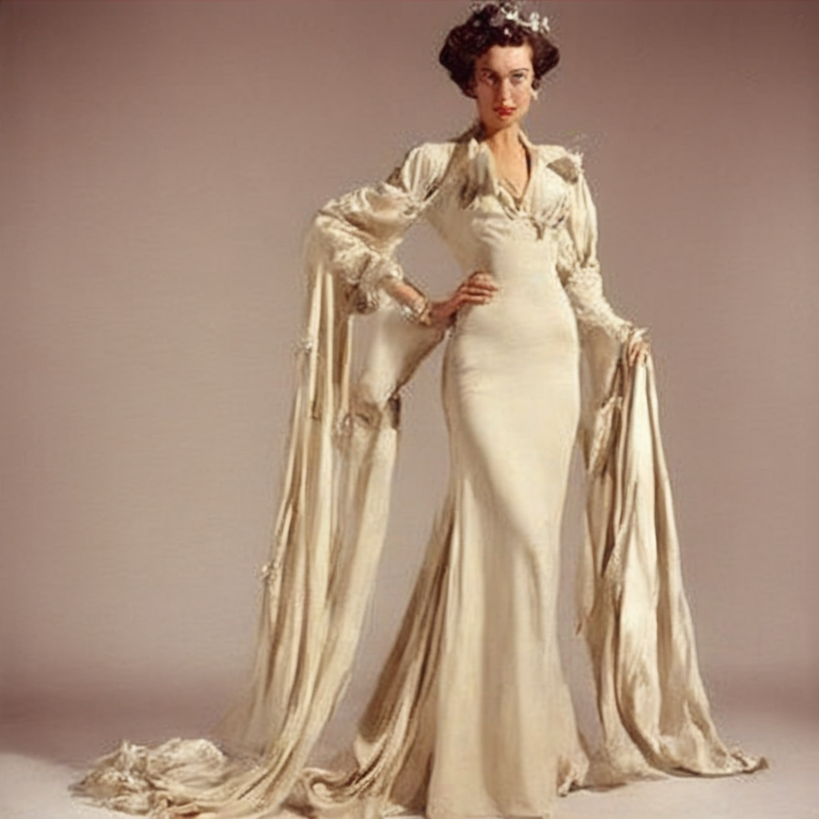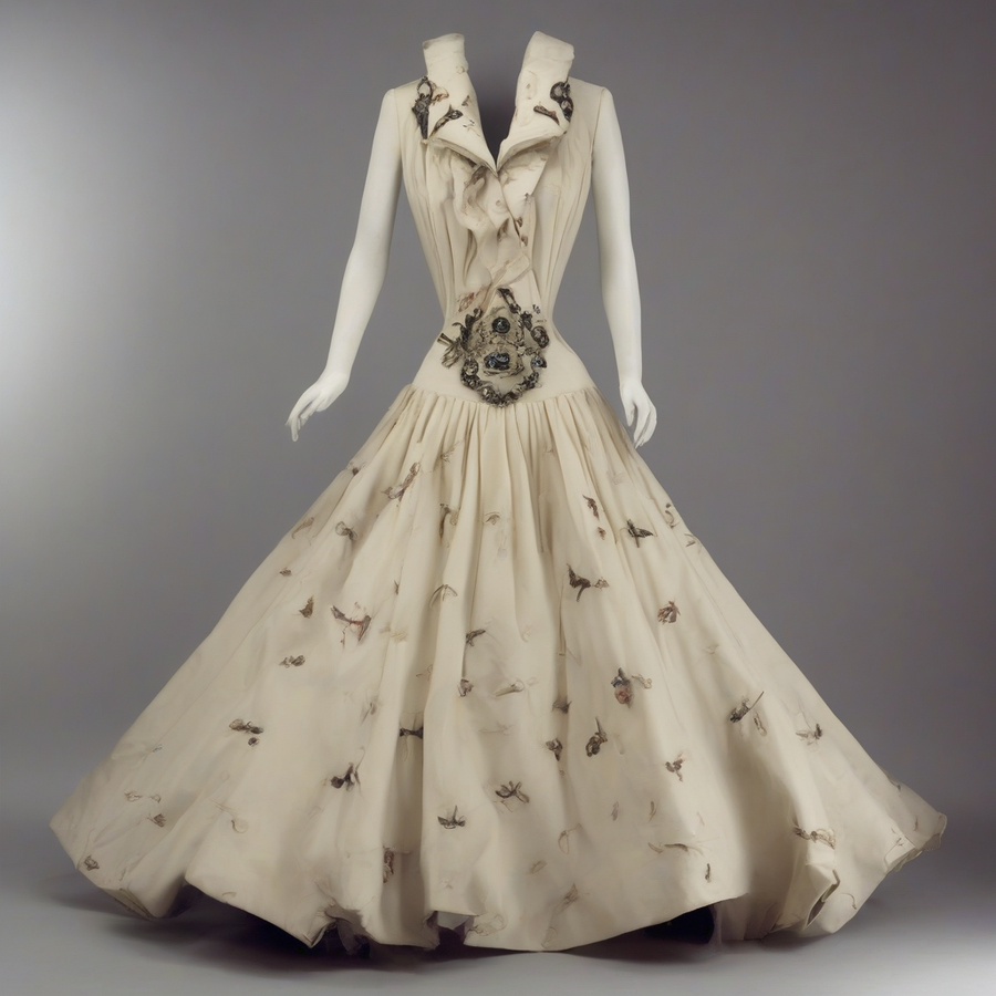 Также я решила попробовать сгенерировать сюрреалистическое платье для современной английской королевы в стиле Сальвадора Дали и модного дома Скиапарелли. Мой выбор пал именно на такую генерацию, поскольку в свое время Сальвадор Дали и Эльза Скиапарелли не один раз сотрудничали и создавали совместные работы в виде платьев, аксессуаров и не только. Мне было интересно, что может предложить нейросеть, особенно, если добавить в этот набор английский стиль.