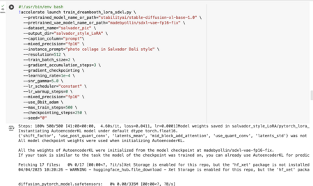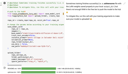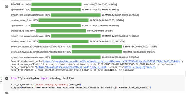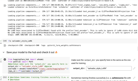 Тут я сохранила веса обученных нейронных сетей в папку «salvador_style_LoRA», потом сохранила на сайт HuggingFace.