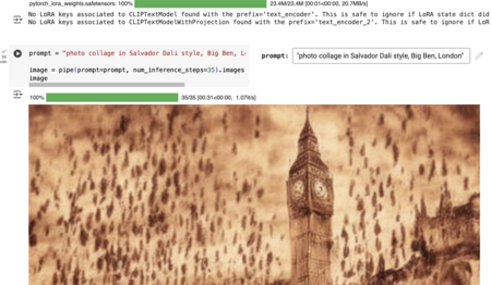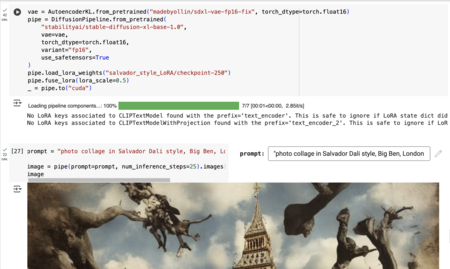 Тут я прогоняю BLIP нейросеть по всем картинкам и создаем для каждой из них описание того, что на ней изображено, дополнительно я добавила собственный префикс к описанию, в виде слов: фотоколлаж в стиле Сальвадора Дали . Таким образом, в описании каждой картинки будет написано, что она нарисована в стиле Сальвадора Дали.