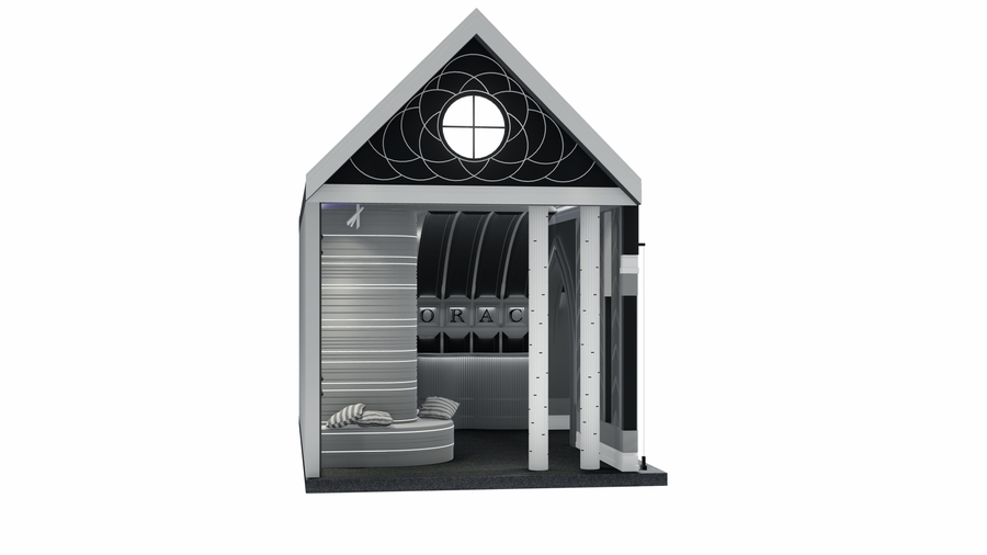 Цветовая гамма стенда монохромна, она представлена десятью оттенками от белого до почти черного. Подсознание раскрашивает все, что видит. Теремок для каждого останется ярким.