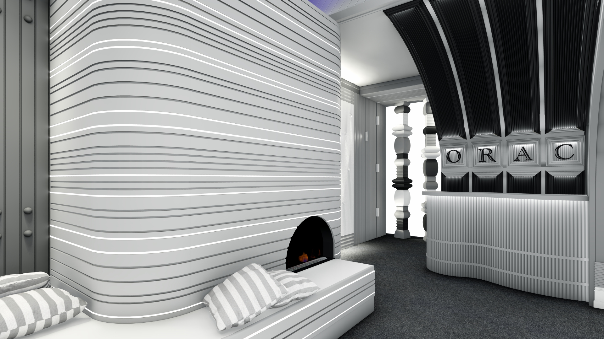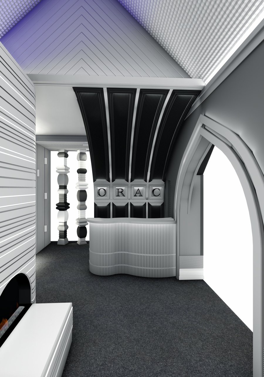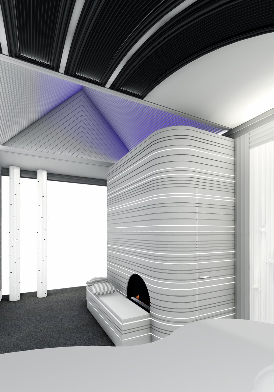 Резной фасад сразу создает атмосферу уюта. Это точно что-то родное, настоящее, из детства. Русская печь зазвучала современно и смело в обтекаемой форме с подсветкой. Стойка ресепшн с секретом: в плане она имеет форму силуэта матрешки. Резные колонны придают сказочности не только своим видом: они вращаются, как в музыкальной шкатулке. Здесь даже есть березы!