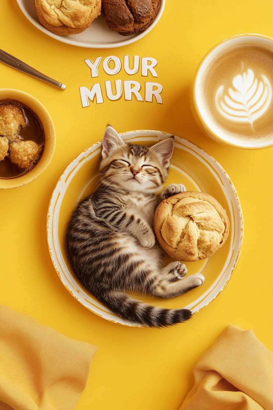 3. Promt: Advertisment poster, cafe «YOUR MURR», Striped Cat lying in a ball on a plate, coffee cups, baked goods, yellow colors, white letters, subject photography, shot from above --ar 2:3