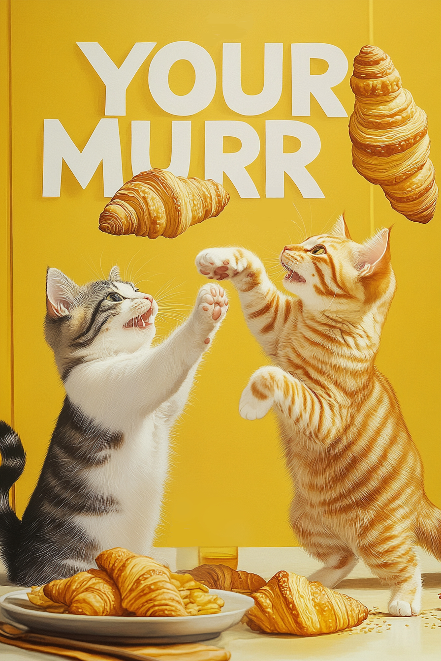 2. Promt: Advertisment poster cafe «YOUR MURR», two cats playing, flying croissants in the background, yellow colors --ar 2:3