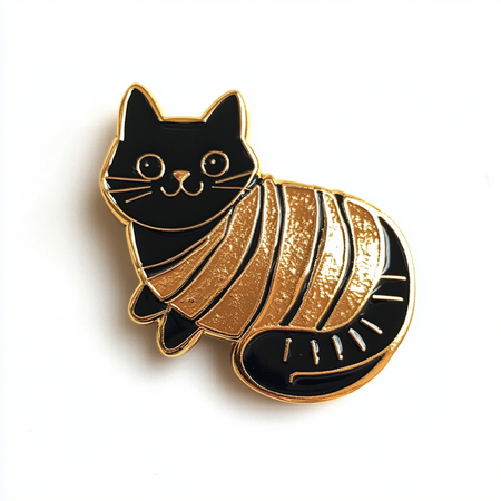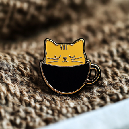 1. Promt: Metal pin croissant cat 2. Promt: Yellow metal pin cat in the cup in minimalistic style