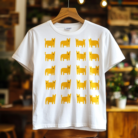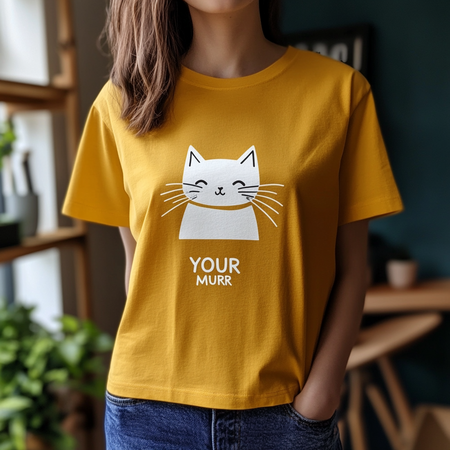 1. White t-shirt with yellow cats ornament 2. Promt: Yellow t-shirt with a little white cat face «YOUR MURR»