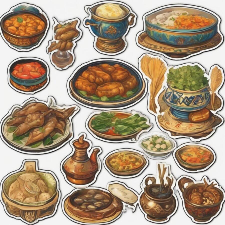Стикерпак — первое, что пришло мне в голову. Его создание далось легко. Первым промтом стал «sticker pack with tataruan fokl dishes». Однако нейросеть не давала желаемого результата и я дополнила промт названиями нужных блюд: «sticker pack with tataruan fokl dishes: chuck-chuck, kastyby, ochpochmak».