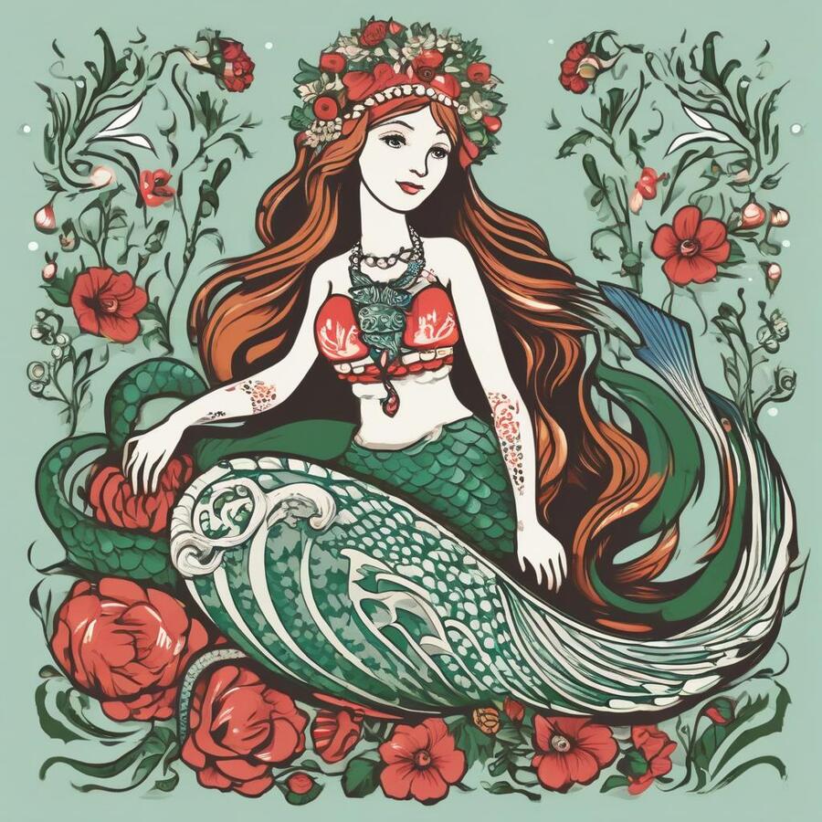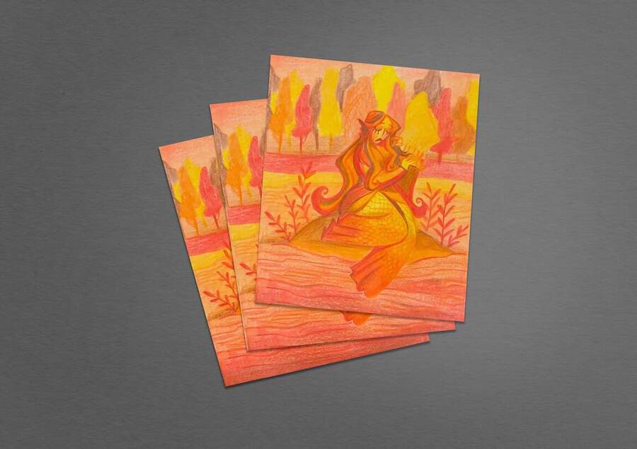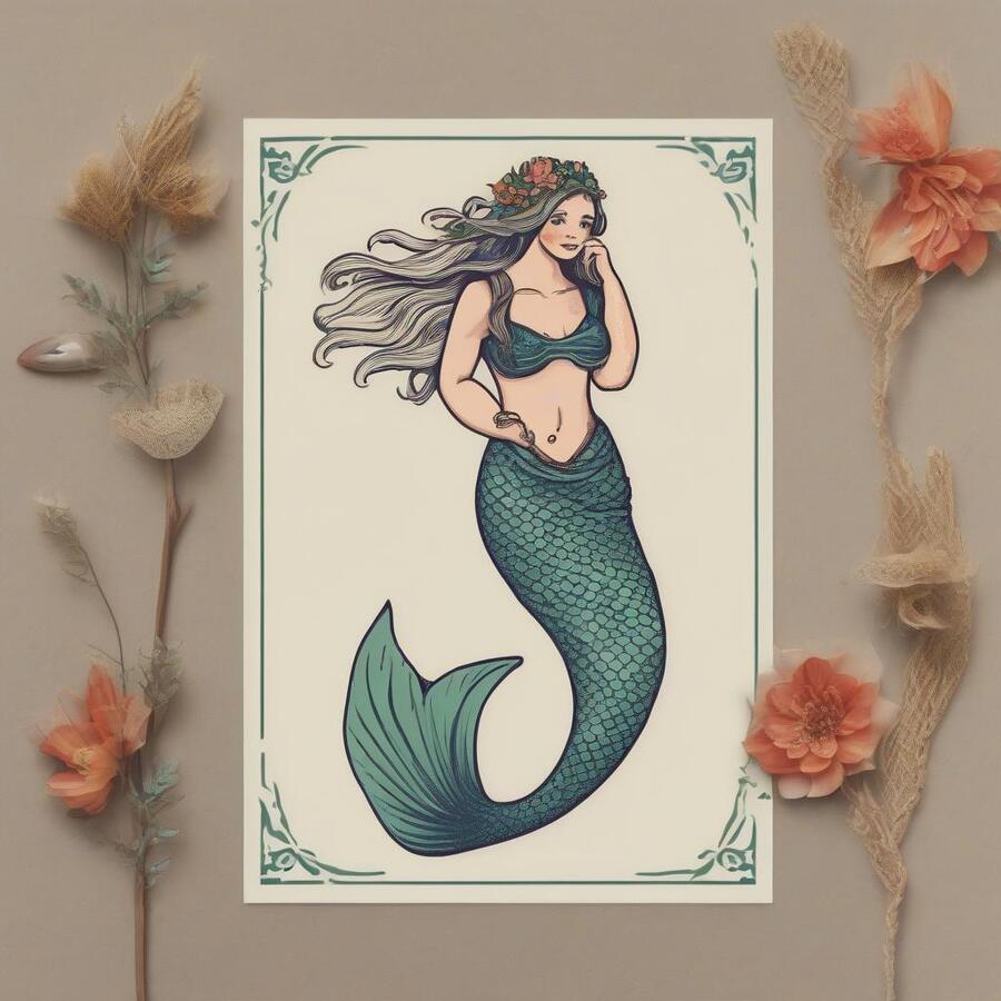 Генерировать открытку с русалкой — не сложно. Однако нейросеть активно и бесповоротно предлагает результаты, на которых русалка выглядит как Ариель из диснеевского мультфильма. Поэтому промт менялся несколько раз. Сначала он выглядел как «postcard mockup with mermaid». Затем «postcard mockup with tatarian mermaid». Спустя несколько неудачных результатов, наконец сформировался промт «postcard mockup with mermaid in folk tatarian dress», давший наиболее удовлетворительный результат.