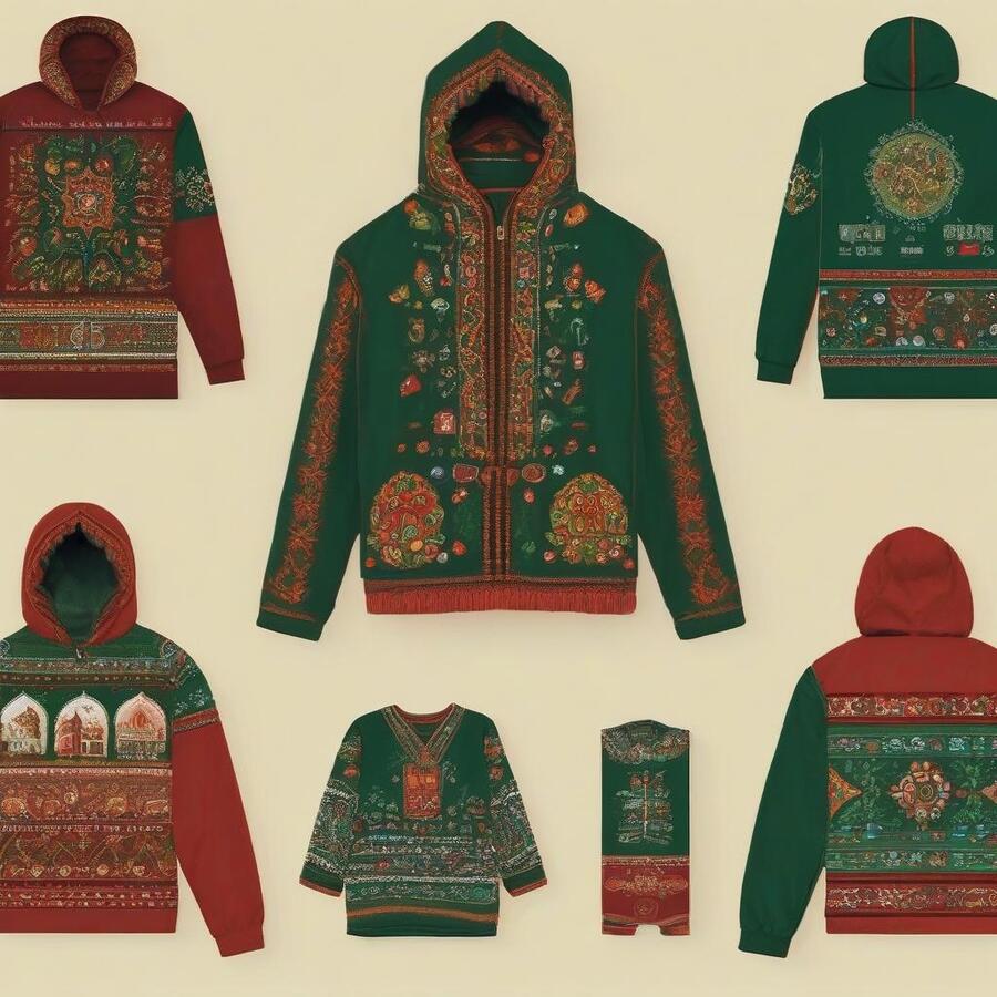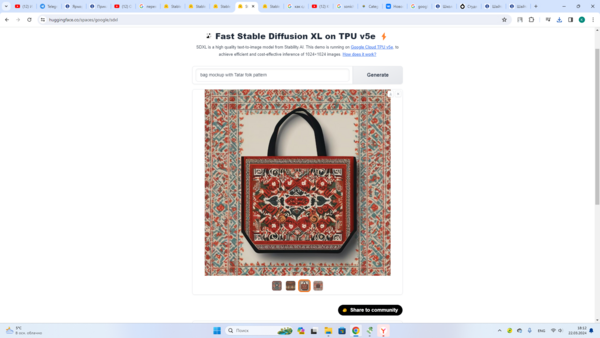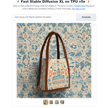 Изначально планировалось показать сайт с мерчом, поэтому я набрала пробный промт: «website design selling Tatarstan folk merch». Результат был странным, совершенно не о том, чего я хотела изначально, но идея толстовок с татарскими народными узорами мне все равно понравилась. Неожиданный результат — тоже резултьтат!