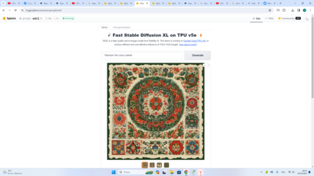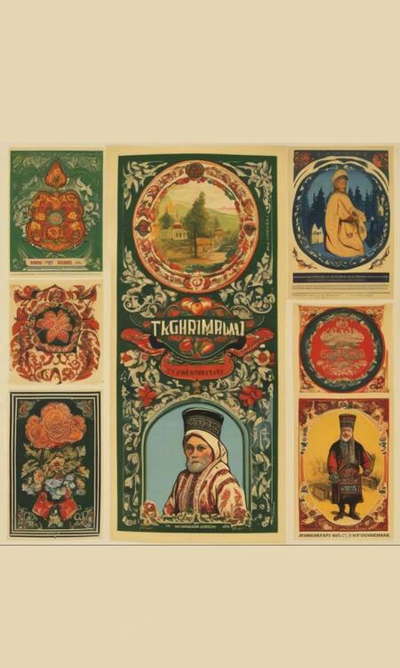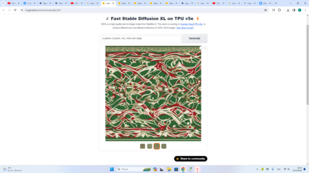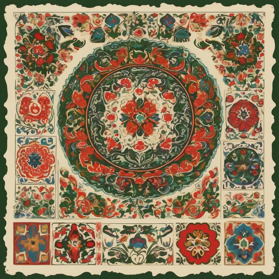 С помощью промта «Tatarstan folk colour palette» нейросеть создавала картинки, напоминающие народные тюркские узоры, напоминающие ковры. Однако помимо подобных картинок, мне хотелось и более абстрактных цветовых решений. Для этой задачи более всего подошел промт: «a pattern of green, red, white and beige».