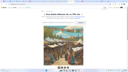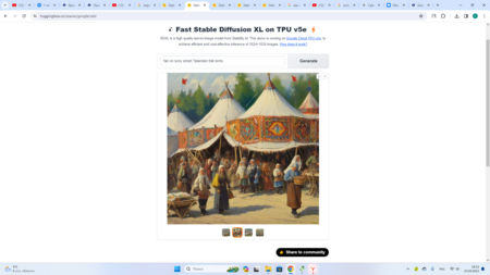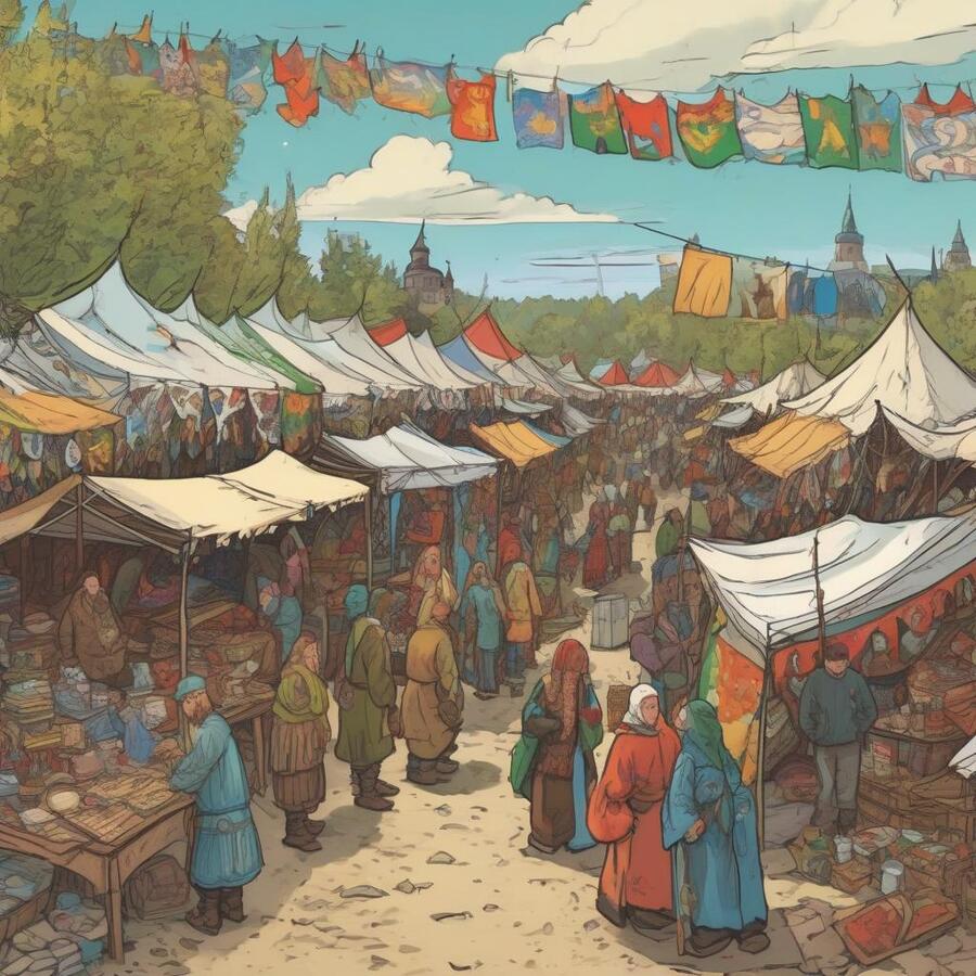 Изначально, при создании пространства ярмарки, я хотела использовать другую нейросеть, чтобы добиться более реалистичной картинки. Однако, попробовав промт: «fair on sony street Tatarstan folk tents», я поняла, что меня привлекают «нарисованные " картинки больше. Формируя промт, я постаралась сочетать желаемое освещения для достижения необходимого настроения и уточнить, что ярмарка должна быть обязательно с палатками. Также я добавила уточнения к продаваемому мерчу, комиксам и попыталась иначе составить промт, добившись иного, но интересного результата: «a tatarstan folk marketplace, with tents, stalls selling comics and merch, colourful "