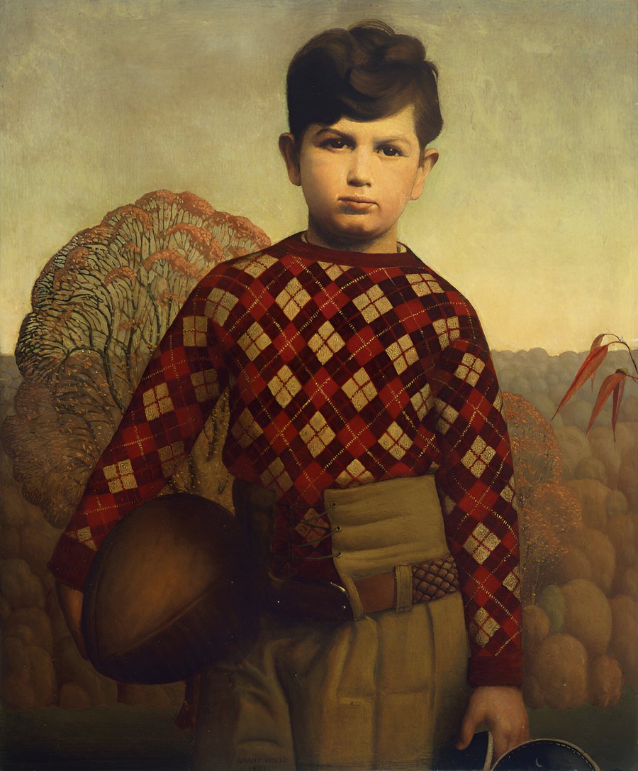 На картине под названием «Свитер в клетку» изображён архетип «всеамериканского» мальчика. Художник изобразил мальчика в футбольной форме, а не в костюме и галстуке, как того ожидали современники. На других портретах того времени дети были одеты в парадную воскресную одежду, которая часто не отражала их реальную, повседневную жизнь. На изображении задний план составляет природный пейзаж, а не реквизит и декорации, что отличает его от традиционных портретов, где фон обычно был сценой или внутренним интерьером.