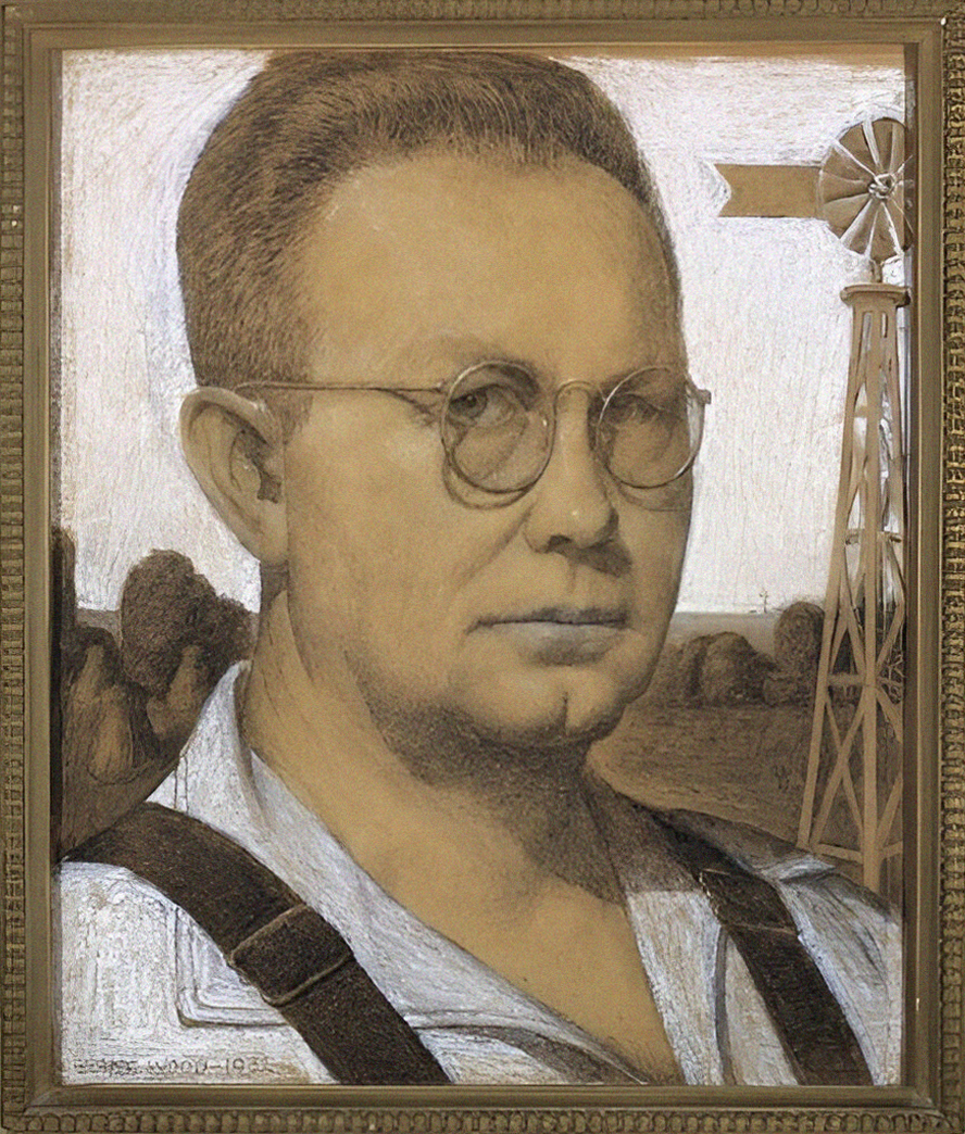 Портреты художника часто были посвящены сельским рабочим и, в частности, фермерам. На своём автопортрете/иллюстрации к своей автобиографии «Возвращение из Богемии», Грант Вуд изображает себя рисующим в окружении людей в сельской одежде на фоне амбара.