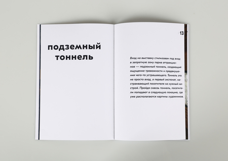 Вход на выставку стилизован под вход в запретную зону парка аттракционов — подземный тоннель, создающий ощущение тревожности и предвкушения чего-то устрашающего. Тоннель это не просто вход, а первый экспонат, настраивающий посетителя на нужный настрой. Пройдя сквозь тоннель, посетители попадают в следующую локацию, где уже располагаются картины художников.
