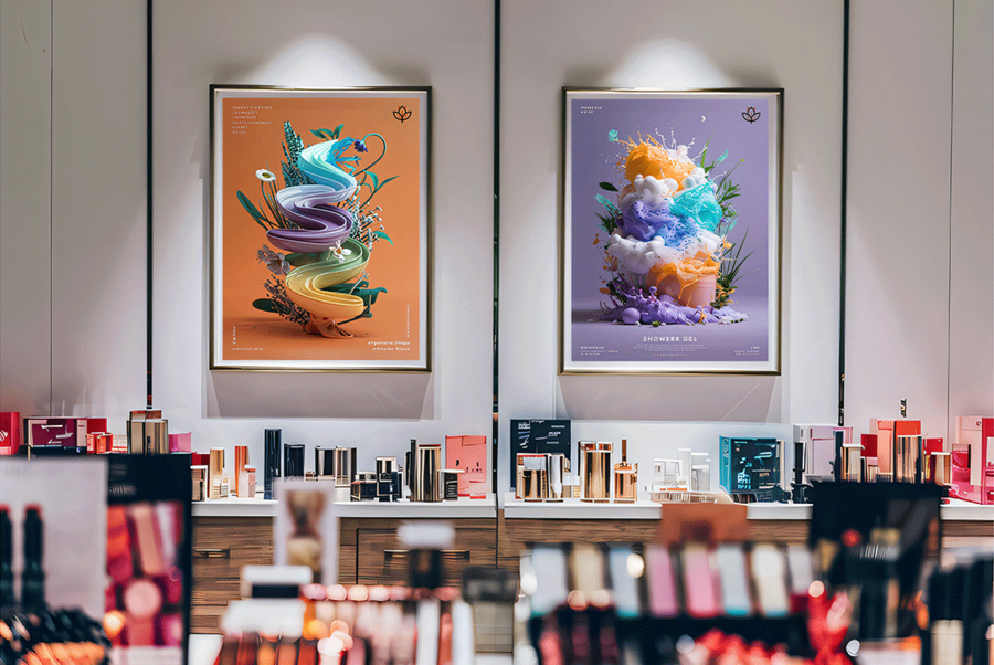 IG: 3×4 plain white frame in the interior of the mall. place for advertisement, photo / two 3×4 plain white frames in the interior of the cosmetic store. Place for advertisement.