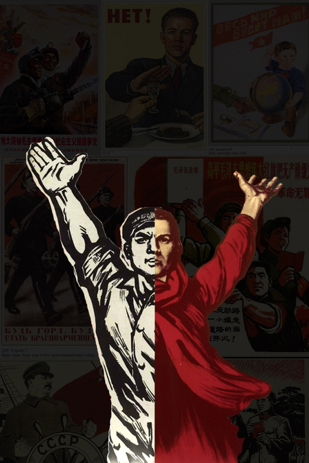 Также стоит отметить, что Сталин — часто возвышается над массой или выступает в одиночестве. Мао — внутри толпы или в ореоле народной любви.