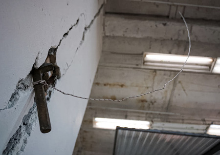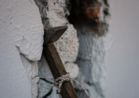 Инсталляция представляет из себя композицию из 4 фотографий с одной стороны стены и конструкцию из спускающегося от потолка молотка, с другой её стороны.