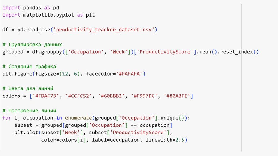 Я решила построить круговую диаграмму, чтобы посмотреть процентное соотношений участников по профессиональной категории, также линейный график, показывающий понедельный средний показатель продуктивности для разных профессий. Кроме того, я буду строить столбчатую диаграмму по возрастным группам для сравнения средних показателей активностей и эффективности и диаграмму рассеяния для определения корреляции между экранным времени и продуктивностью.