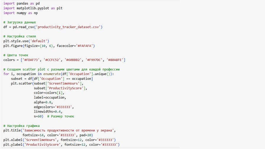 Диаграмма рассеяния показывает показывает корреляцию между переменными. В данном случае были выбраны ScreenTimeHours и ProductivityScore, сгруппированные по профессиям.