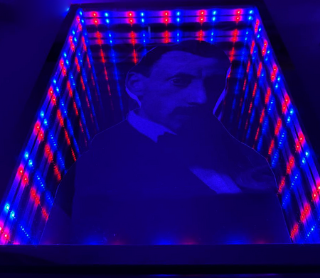 В данном портрете мне хотелось отобразить эмоциональное выражение движения и динамики, к которым так стремился художник в своих работах футуристического периода. Динамизм появлялся во множестве его работ, например, «Динамизм бегущего ночного поезда», «Динамизм автомобиля», «Динамизм движений женщины». Взяв принцип Луиджи Руссоло за основу, я представила портрет, созданный в виде бесконечного зеркала.