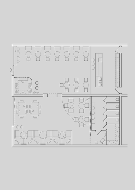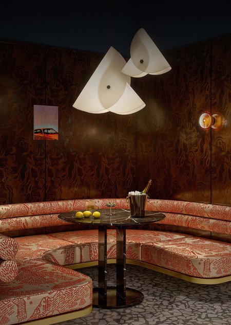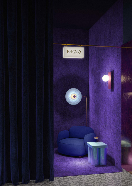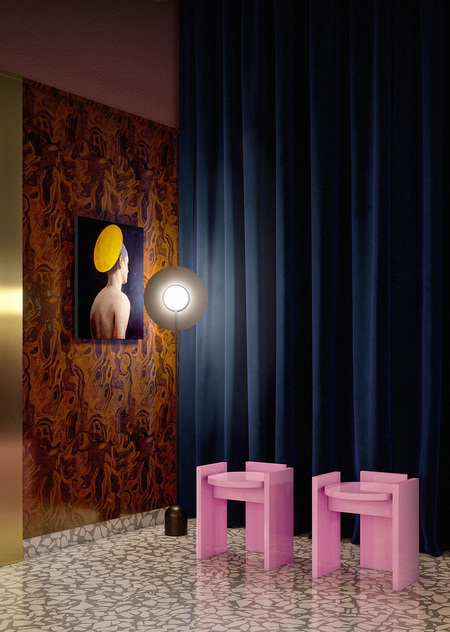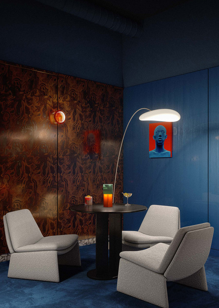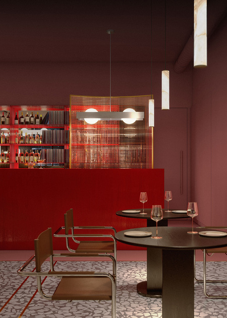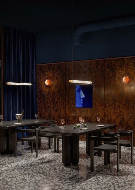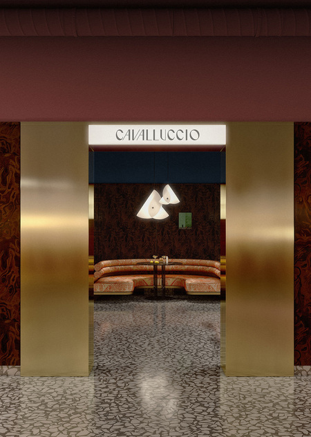 Cavalluccio — это траттория и диско-бар с фокусом на средиземноморскую кухню. Cavalluccio (произносится как Кавалуччо) — в переводе с итальянского означает «Морской конек», поэтому морской мотив нашел прямое воплощение в деталях интерьера. Основные цвета пространства также напрямую связаны с морской тематикой: более просторный зал, рассчитанный на большие компании, где по вечерам играет диджей выполнен в терракотовых оттенках, отсылающих к теме коралла. Второй зал — более камерный и уединенный — оформлен в глубоком синем цвете, цвете моря. Вторым источником вдохновения стал «итальянский» стиль 50-х и 60-х годов, поэтому в отделке используется изысканный шпон, элегантные драпировки и различные детали (светильники, декор), создающие атмосферу типичной траттории. В проекте интерьера использовались различные предметы Kronos Studio: столик CRC, обеденные столы RND, VRN и табуреты SQR.