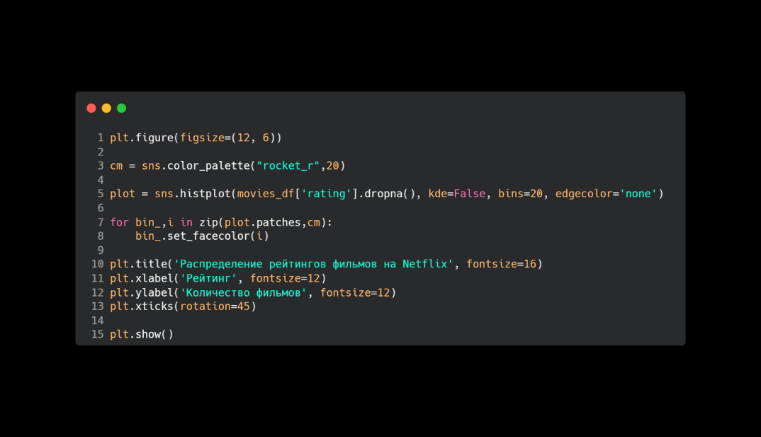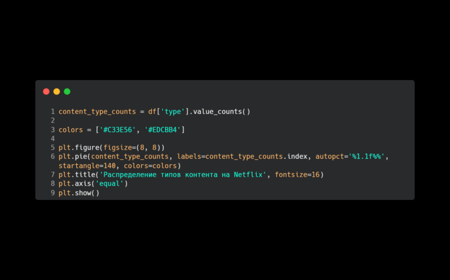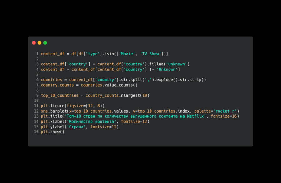 В своем коде для анализа я использовал сайт Kaggle, откуда взял датасет со статистикой Netflix, в которой есть: название, тип (фильм или сериал), режиссер, актерский состав, страна, дата добавления на стриминг, год выпуска, рейтинг, длительность, жанры и описание.