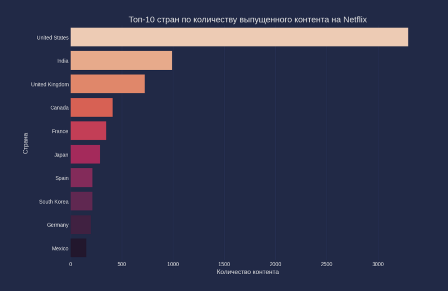 Далее мне было интересно выяснить сколько контента каждой страны есть на сервисе. США лидируют с большим отрывом, что неудивительно, учитывая доминирование Голливуда и широкое распространение американской культуры. Далее, на удивление, идет Индия, что подчеркивает влияние Болливуда и значительное потребление локального контента на сервисе, а также указывает на растущую международную привлекательность индийских фильмов и сериалов, которые известны своим своеобразным монтажем и сценариями. В топе есть европейские страны, которые стабильно дают качественное кино высокого уровня. Также присутствуют и азиатские страны: Япония известна своим аниме и креативным подходом к жанровым фильмам, в то время как Южная Корея стала международно признанной благодаря высоким стандартам производства и популярным K-драмам.