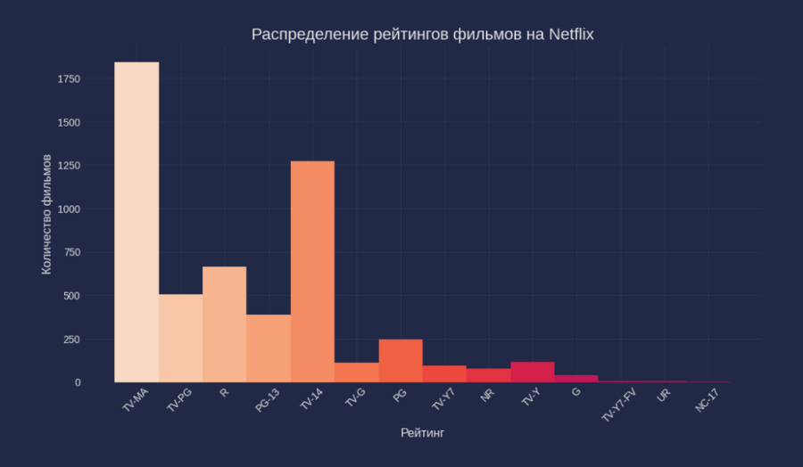 Проанализировав рейтинга контента на Netflix, можно понять, что стриминг в основном создает фильмы и сериалы для взрослой аудитории, но также имеет и контент для тех, кому меньше 18 лет.