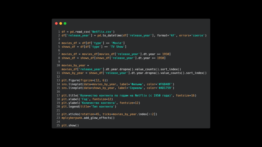 В коде подключаю библиотеки Pandas для анализа, Matplotlib для визуализации, SeaBorn и mplcyberpunk для стилизации графиков.