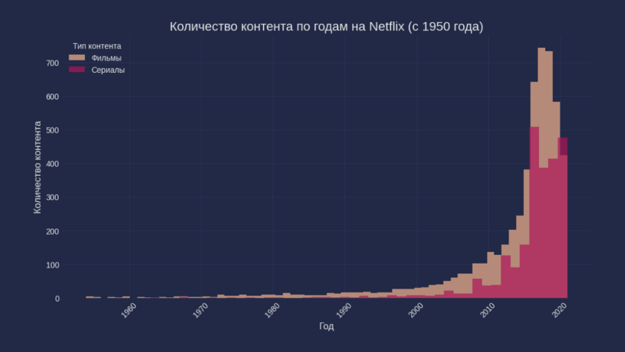 Для анализа я использовал различные виды диаграмм: круговую, столбчатые, динамическую. С помощью них было наиболее логично и просто представлять изменение количества контента на платформе на протяжении всего времени ее существования.