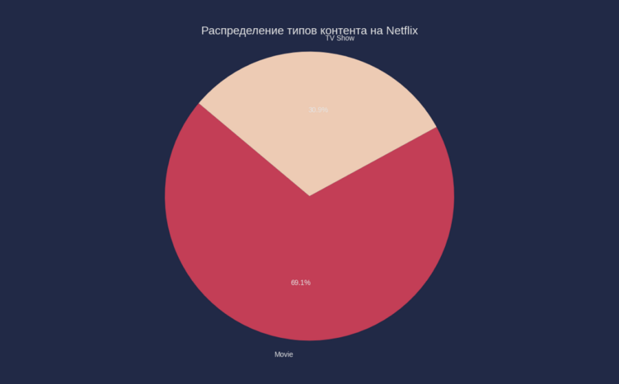 Для начала мне было интересно узнать, какое процентное соотношение фильмов и сериалов на Netflix. Как оказалось, фильмов больше (69,1%), что довольно удивительно с учетом того, что стриминги в целом стали популярны за счет сериалов, которые всегда выходили онлайн.