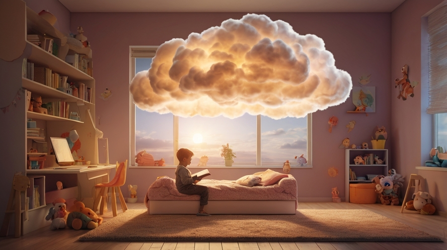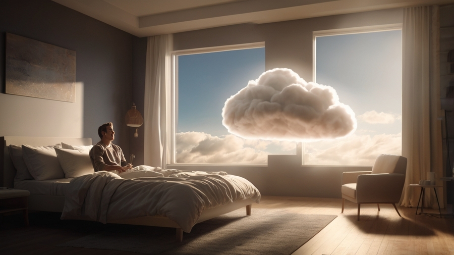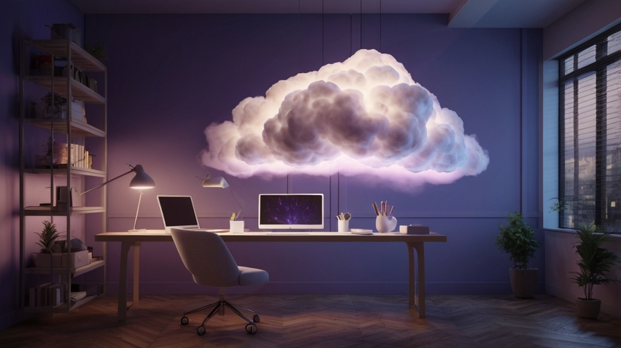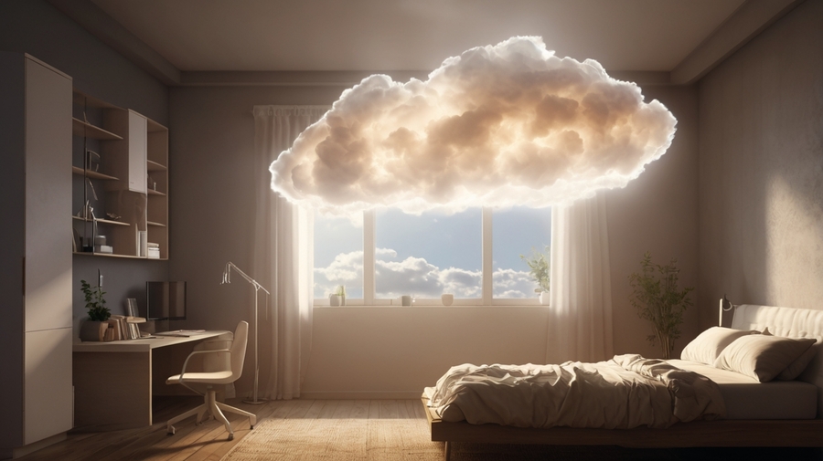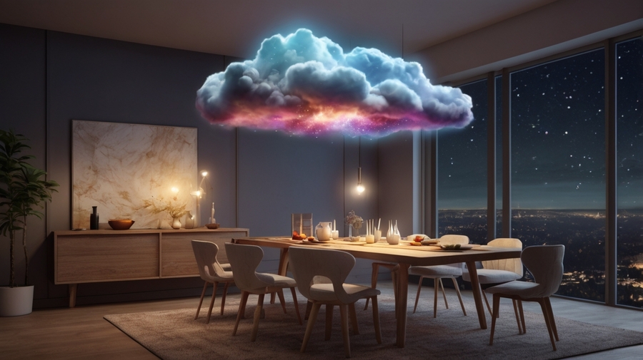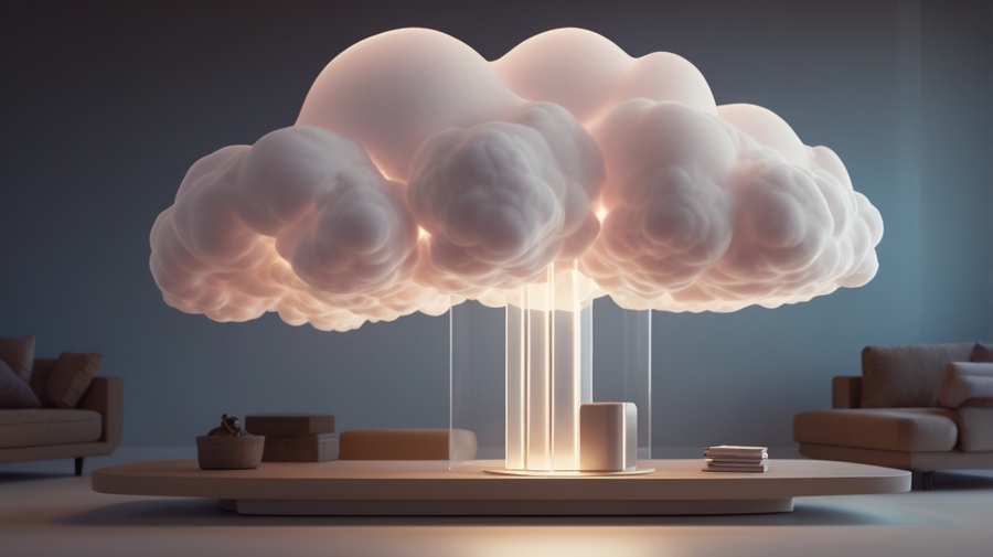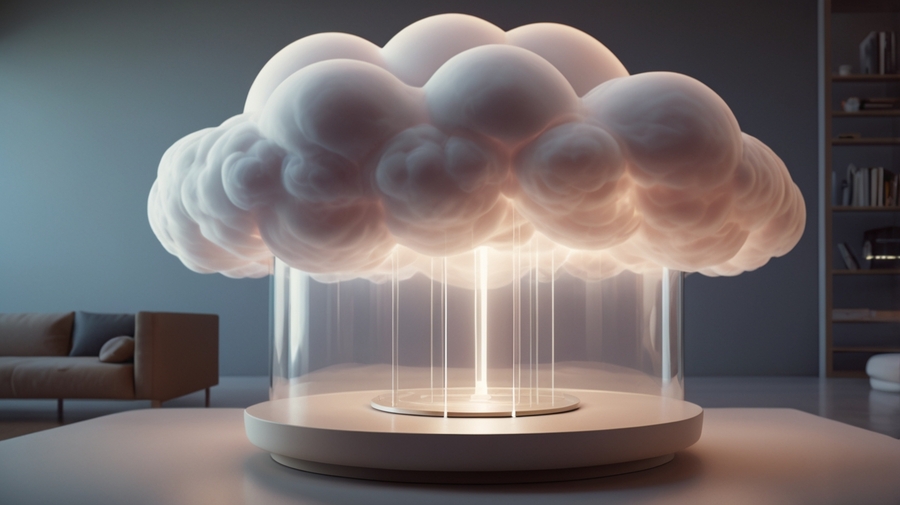 A futuristic, minimalistic, light-colored close-up of gadget from the future, which creates a cloud into the room and glows with muted colors. Style reference mid из 1 картинки.