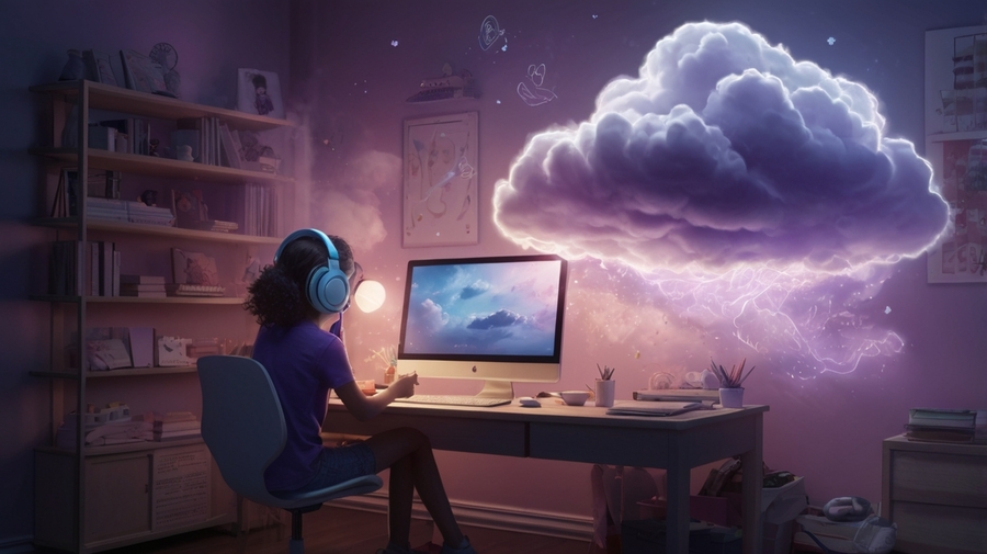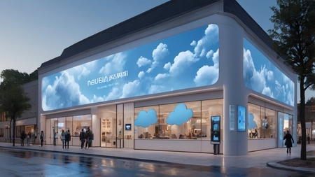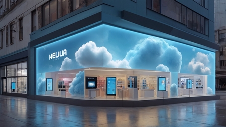 The exterior of Nebula store with a futuristic design featuring cloud-shaped signage. Large digital display showcases floating clouds drifting across the screen. Cold color palette, light blue accents.