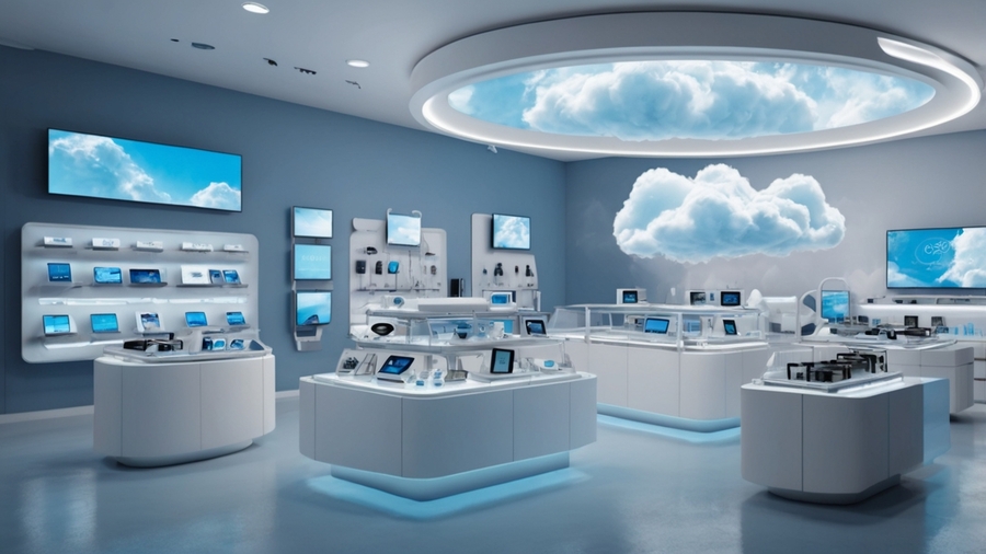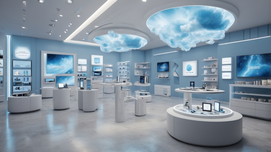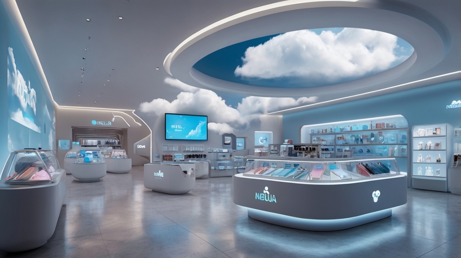 Nebula store interior with a futuristic design featuring cloud-generating gadgets. Large digital displays showcase floating clouds. Cold color palette with light blue and white accents.